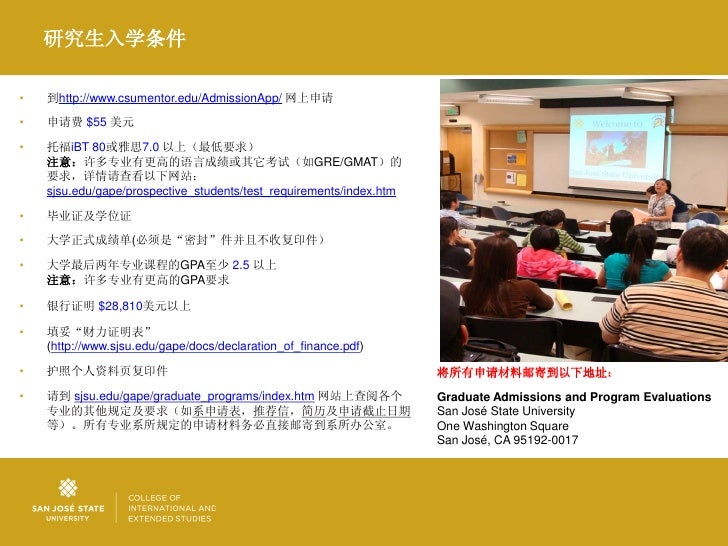 Completing the graduate admission process. Please for admission to the university is a 2.5 GPA in the last institution where you earned a degree. Many SJSU graduate programs have higher GPA admission standards than the university’s minimum GPA requirement. ... Return Doc
